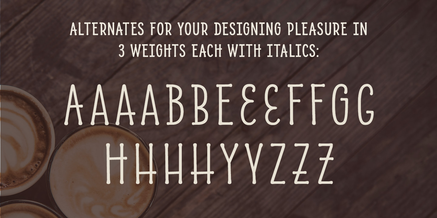 Bring some sass to your signage! Alasassy is a font inspired from Sharpie pen drawings, featuring ink ball terminals. The Caps version features a mix of uppercase and lowercase letters that share the same cap height and baseline. There are several alternate characters with a mix of high and low crossbars as well as crossbar overhang options and language support for each. The Pro versions include Greek and Cyrillic.